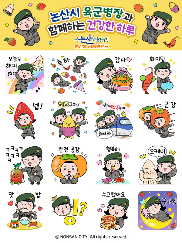 ‘논산시 육군병장과 함께하는 건강한 하루’라는 주제로 제작된 이모티콘은 논산시 농산물 공동브랜드 마스코트 ‘육군병장’과 딸기, 대추, 고구마, 젓갈, 곶감 등 지역 대표 농특산물을 소재로 제작됐다.