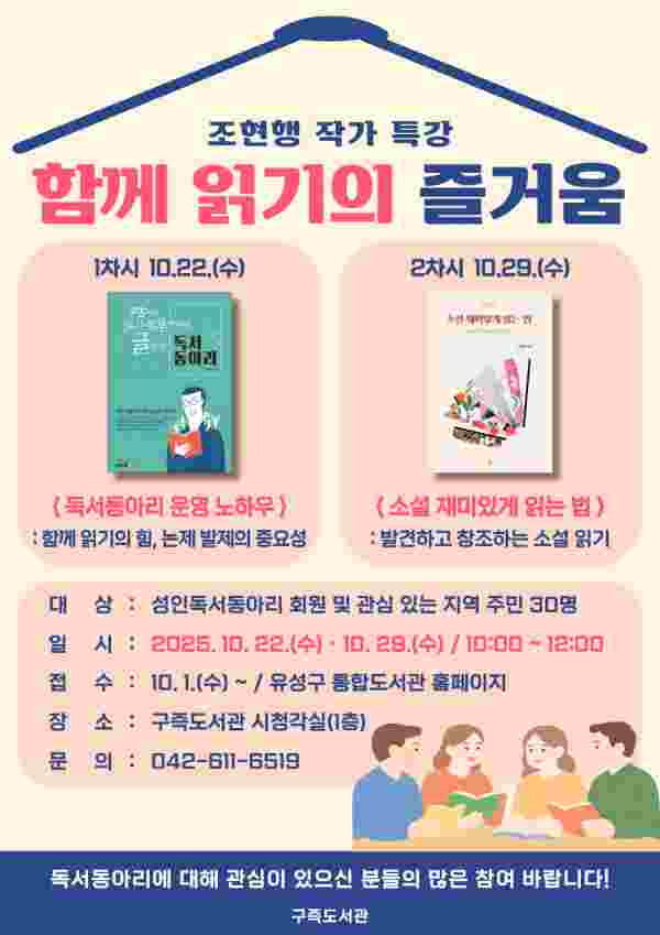참여 신청은 10월 1일부터 21일까지 유성구 통합도서관 홈페이지에서 선착순으로 가능하며 자세한 사항은 구즉도서관으로 문의하면 된다.