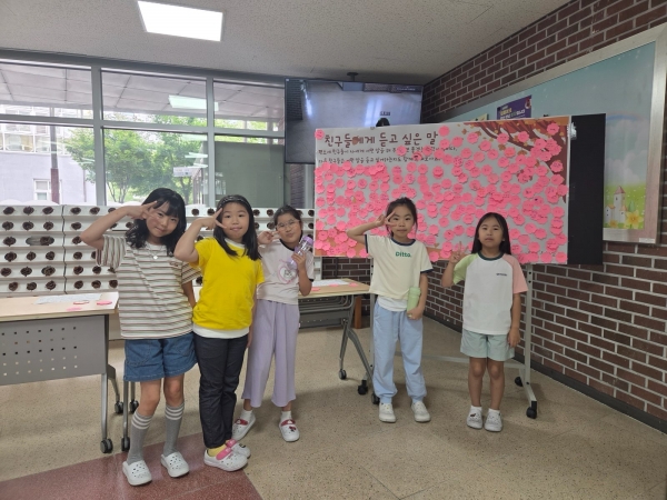 △22일 ‘친구에게 듣고 싶은 말 적기’△23일 ‘부모님·선생님에게 듣고 싶은 말 적기’ 활동을 진행하며학생들이 직접 쪽지에 작성해 게시판에 붙이며 같은 말이라도 상대방이 편안하게 받아들일 수 있는 표현을 배우는 기회를 제공하고자 한다.