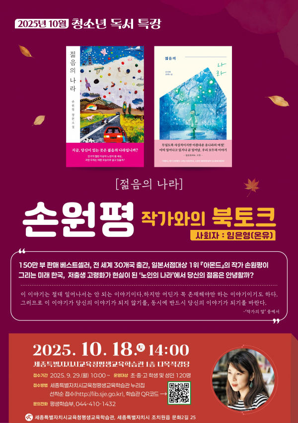 [Ytv영상스토리]세종시교육청평생교육학습관(관장 김희경, 이하 평생교육학습관)이오는 10월 18일(토) 오후 2시, 소설가이자 영화감독인 손원평 작가를 초청해 책마당(북콘서트)를 개최한다.