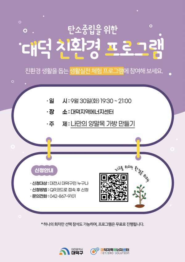 대덕지역에너지센터에서 진행되는 이번 프로그램은 재활용·탄소중립·녹색 생활 등 생활 밀착형 주제로 남녀노소 누구나 부담 없이 환경 보호에 참여할 수 있도록 구성됐다.