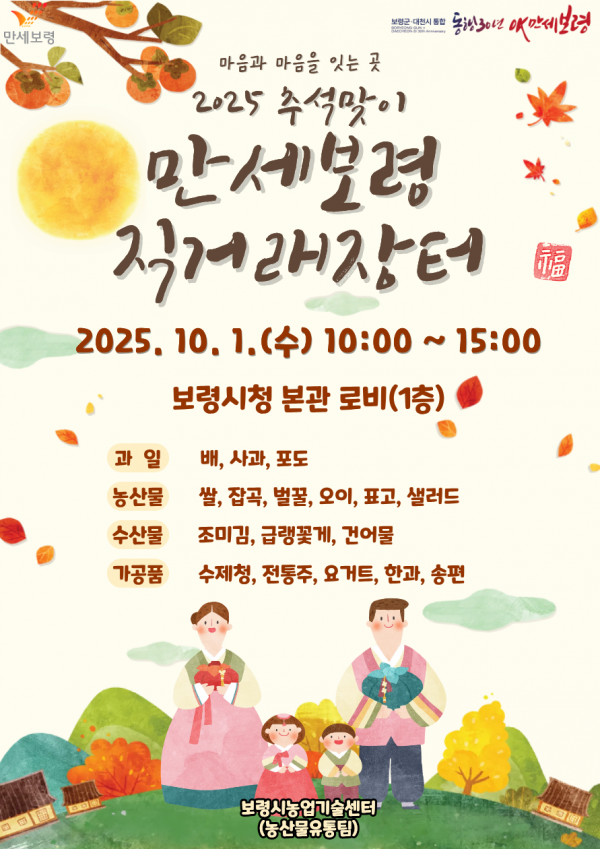 [Ytv영상스토리] 보령시는 추석을 맞아 10월 1일 보령시청 본관 1층 로비에서 ‘2025 추석맞이 만세보령 농특산물 직거래장터’를 운영한다고 밝혔다.