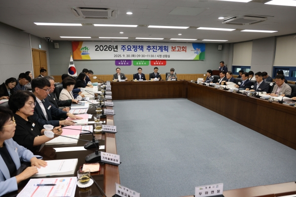 보고회 순서는 2026년도 정책 여건과 재정 전망, 시정 운영 방향, 핵심 정책과제에 대한 전략기획감사실장의 총괄 브리핑 후 부서별 신규 시책과 주요 정책에 대한 업무 보고가 진행됐다.