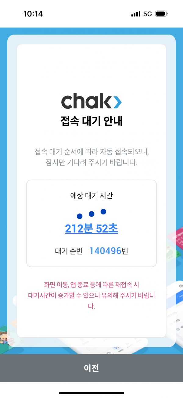10월 1일 오전 기준, CHAK 앱 접속 대기 화면에는 최대 140,496명이 동시에 접속하는 장면이 확인됐으며 예상 대기시간은 212분에 달했다.