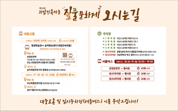 한편 시는 궁평저수지황톳길 주차장, 서남대부근 공터 등 2개소의 임시주차장을 마련하고 20분 간격으로 셔틀버스를 운행하며 온양온천역에서 행사장까지 40분 간격으로 셔틀버스를 운행할 계획으로 방문객들의 편의 제공에 최선을 다하겠다고 전했다.