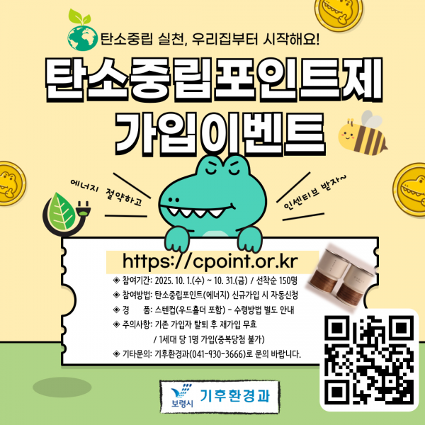 보령시, 생활 속 탄소중립 실천을 위한 탄소중립포인트 에너지 분야 신규가입 이벤트 추진