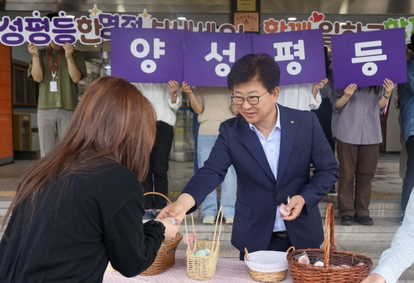 이날 현장에서는 실생활에서 사용할 수 있는 줄자 등 홍보 물품을 나눠주며 성평등 실천 메시지와 대덕구의 저출생 대응 정책을 함께 안내했다.