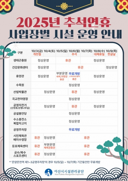 아산시시설관리공단, 추석 연휴 사업장별 시설운영 안내