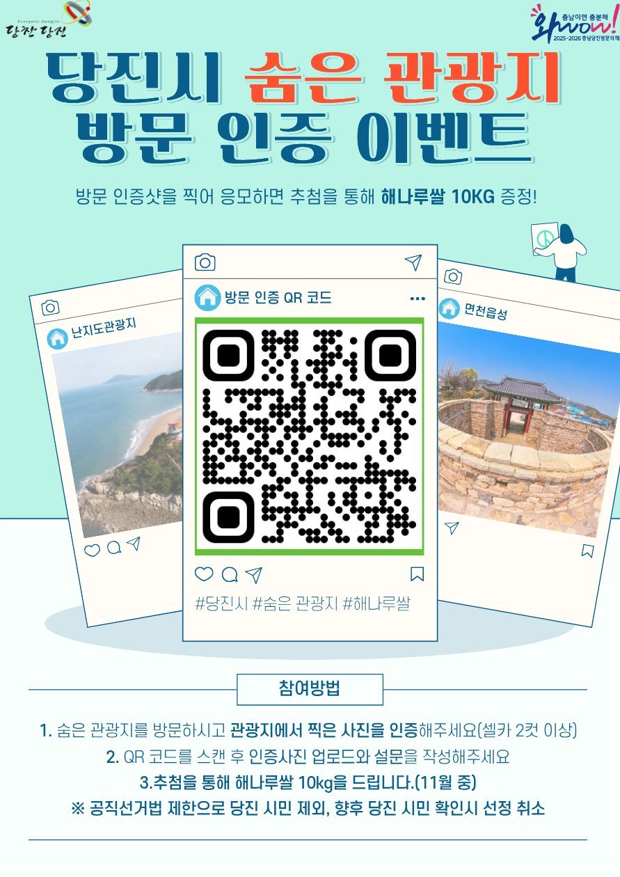 참여 방법은 면천읍성 또는 난지도관광지를 방문해 현장에 설치된 이벤트 홍보물의 정보무늬(QR코드) 사이트에 접속 후, 방문 인증사진과 간단한 응모 정보를 제출하면 된다.