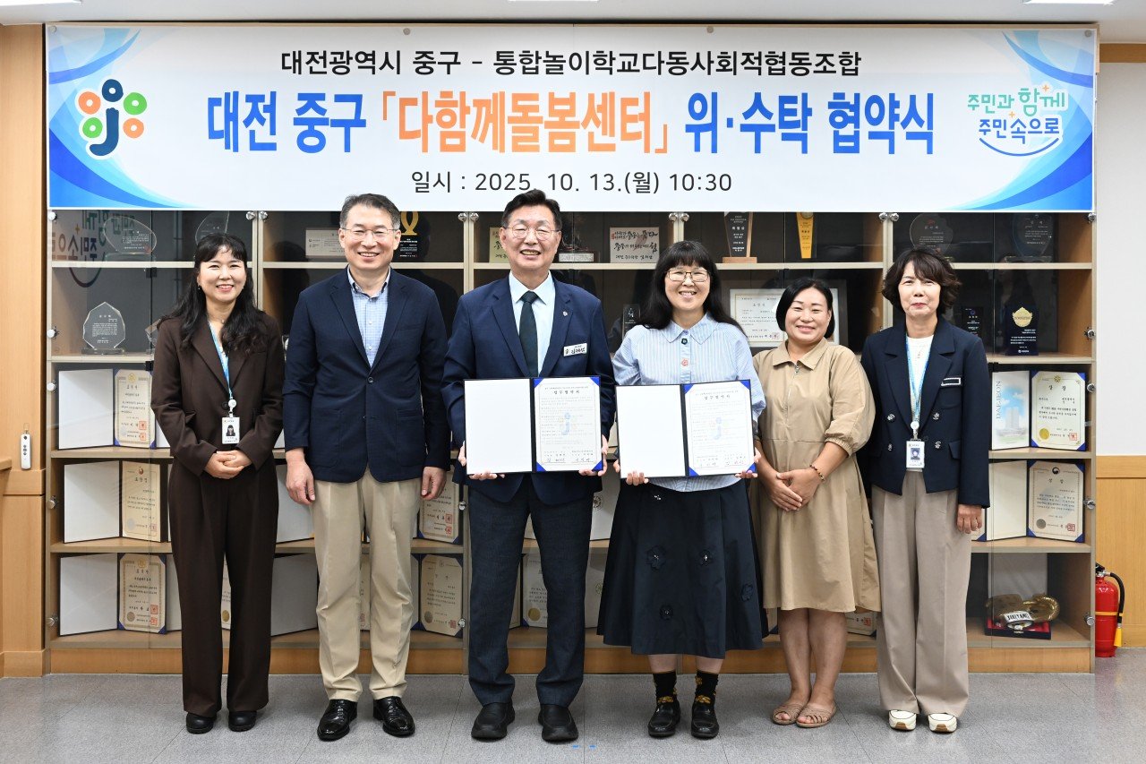 대전 중구(구청장 김제선)는 13일 통합놀이학교다동 사회적협동조합(대표 이미라)과 다함께돌봄센터 석교 1호점 위수탁 운영협약을 체결했다고 밝혔다.