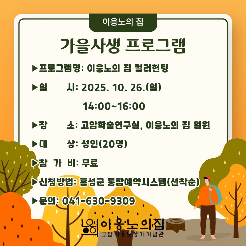 [Ytv영상스토리] 홍성군 고암이응노생가기념관(이하 이응노의 집)은 오는 26일(일) 오후 2시부터 4시까지, ‘가을사생 프로그램’을 운영한다고 밝혔다.