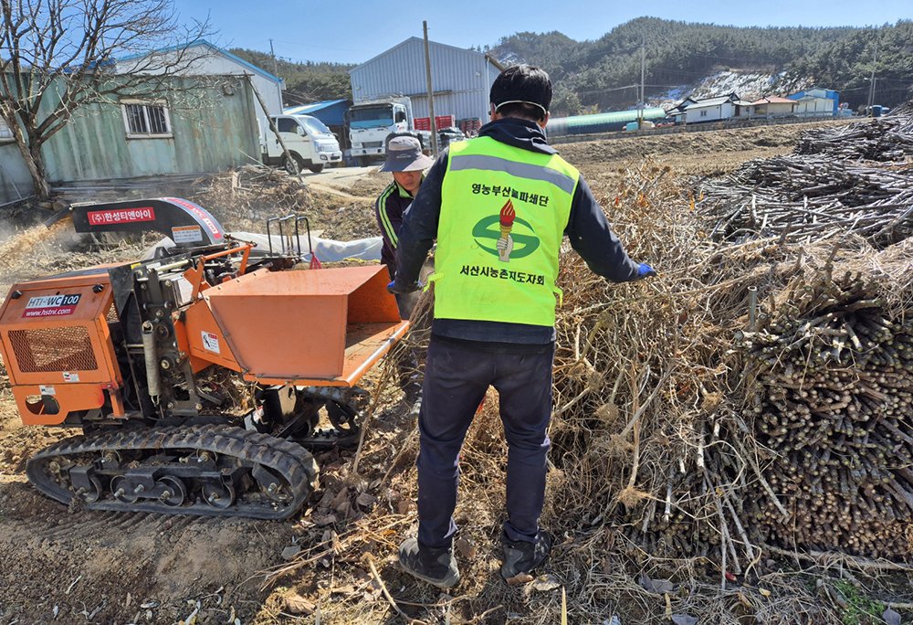 지난 2월 영농 부산물 파쇄단이 농가를 찾아 영농 부산물 파쇄를 지원하는 모습 (사진제공=서산시)