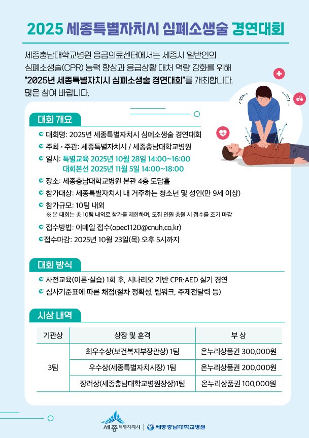 [Ytv영상스토리] 세종시(시장 최민호)가 다음달 5일 세종충남대학교병원 도담홀에서 개최하는 2025년 세종시 심폐소생술(CPR) 경연대회 참가자를 모집한다.