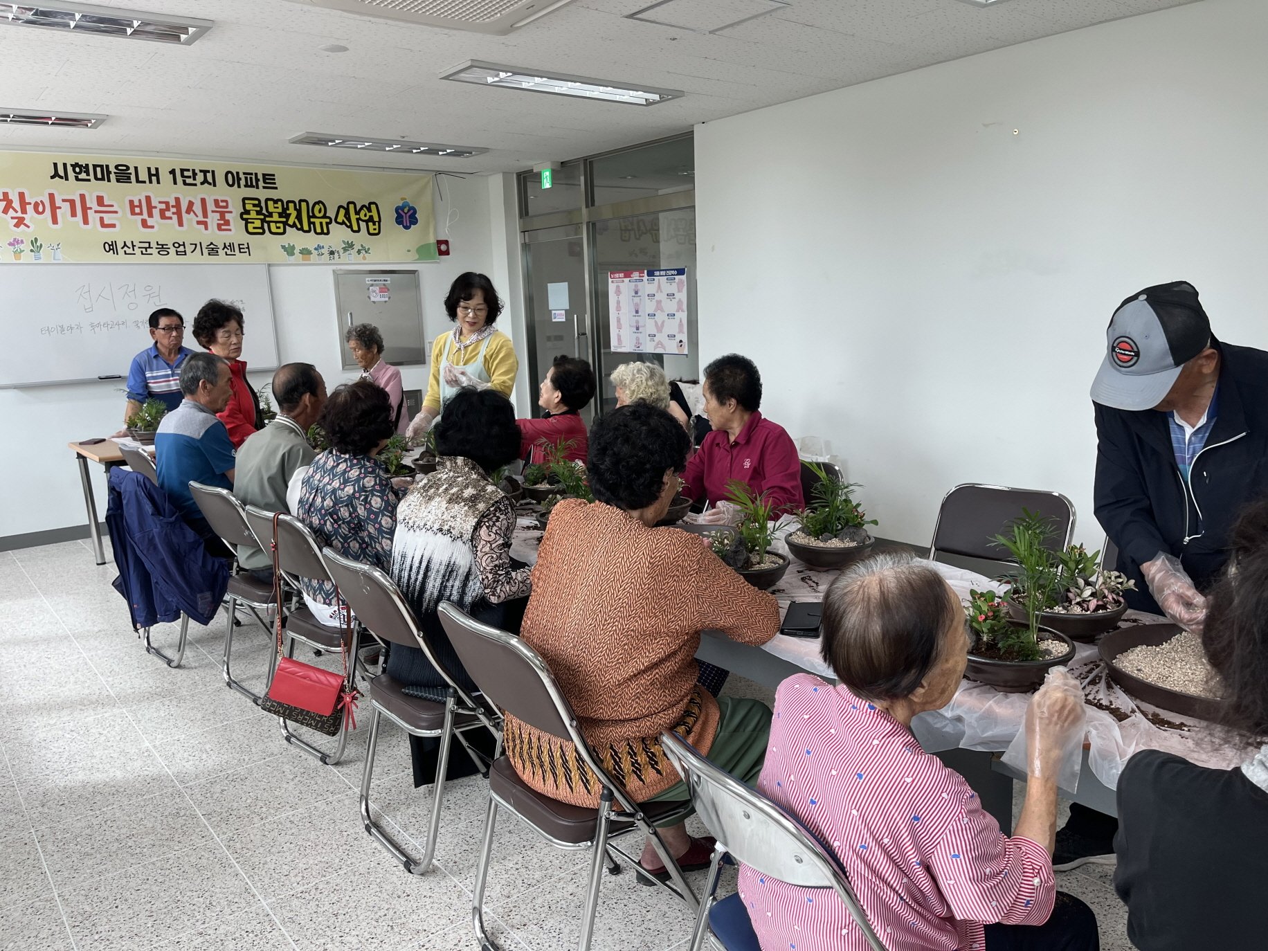 사진설명 : 예산 시현 LH1단지 아파트에서 진미녀 강사로부터 화분 심기 및 병해충 관리 교육을 받는 어르신들.