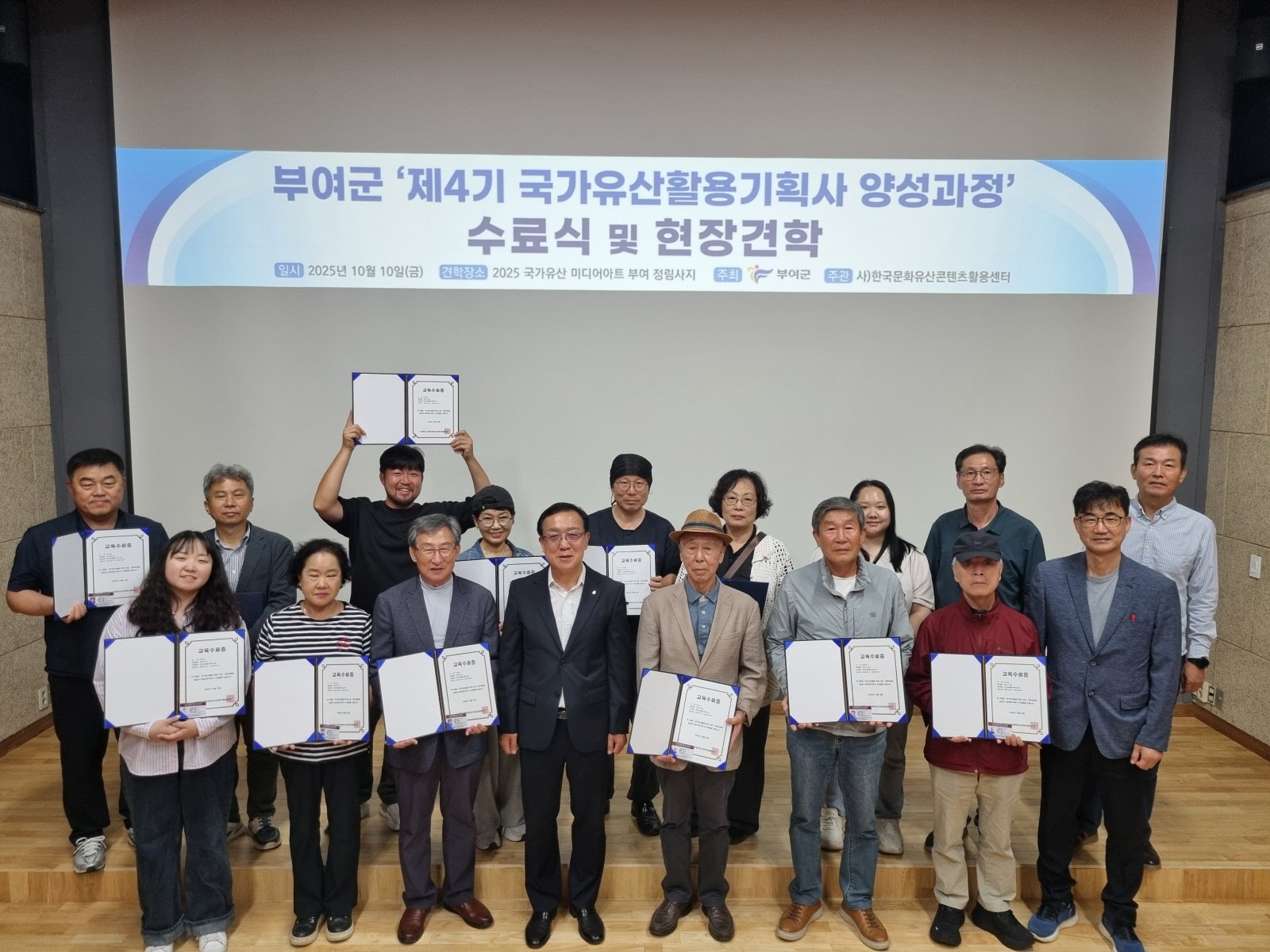 [Ytv영상스토리] 부여군(군수 박정현)은 지난 10일 정림사지박물관에서 ‘제4기 국가유산활용기획사 양성 과정’의 수료식을 개최했다고 밝혔다.