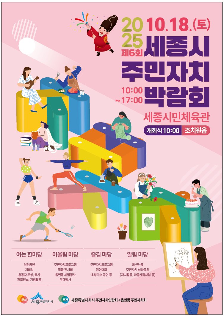 [Ytv영상스토리] 세종시(시장 최민호)가 오는 18일 조치원읍 세종시민체육관에서 ‘주민의 손길로 가꾸어, 세종의 내일을 꽃피우다’를 주제로 제6회 세종시 주민자치박람회를 개최한다고 밝혔다.