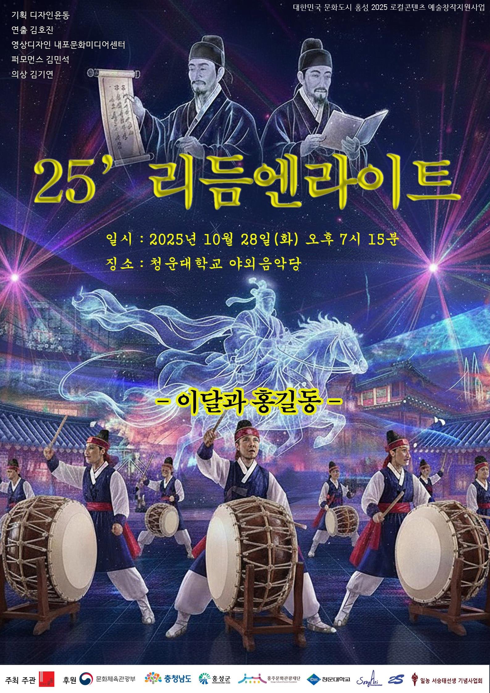 [Ytv영상스토리] 홍주문화관광재단은 오는 28일 오후 7시, 청운대학교 야외음악당에서 ‘25’ 리듬엔라이트(부제: 이달과 홍길동)’ 공연을 통해 홍성의 역사적 인물들과 문화유산을 새로운 시각으로 재조명하며 지역 기반 예술 콘텐츠의 발전을 도모한다.
