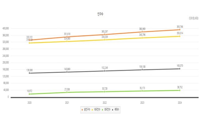 통계청 ‘주민인구 통계’에 따르면 2024년 기준 아산시의 청년인구는 9만 5,727명으로 2021년 1월(9만 1,304명) 대비 4,423명(4.84%p) 증가했다.