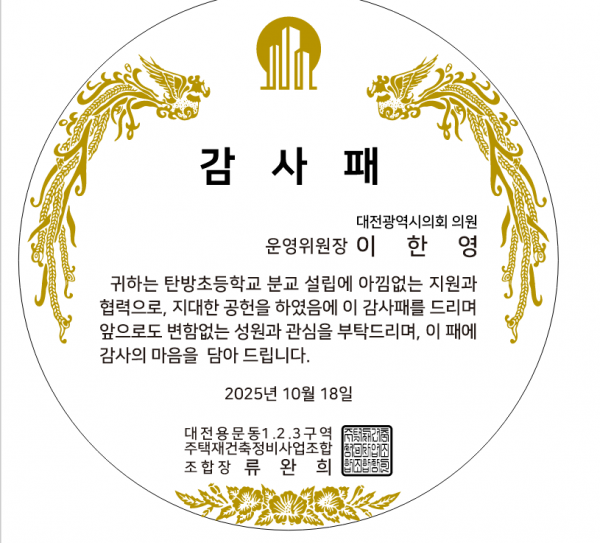 이날 감사패는 이한영 의원이 탄방초등학교 용문 분교 설립과 지역 교육환경 개선에 기여한 공로를 높이 평가해, 용문동 1·2·3구역 주택재건축정비 사업조합이 감사의 뜻을 담아 수여했다.
