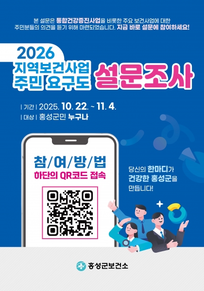 [Ytv영상스토리] 홍성군보건소는 주민들의 건강 수요를 반영한 보건정책 추진을 위해 ‘지역보건사업 주민 요구도 설문조사’를 오는 22일부터 2주간 실시한다고 밝혔다.