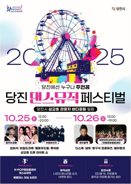 [Ytv영상스토리] 당진시가 오는 25일과 26일 이틀간 삽교호 관광지 바다공원 일원에서 ‘2025년 당진 댄스&뮤직 페스티벌’을 개최하며 '춤과 음악으로 하나 되는 당진, 당진에선 누구나 주인공'이라는 주제로 화려한 가을 축제의 장을 펼친다.