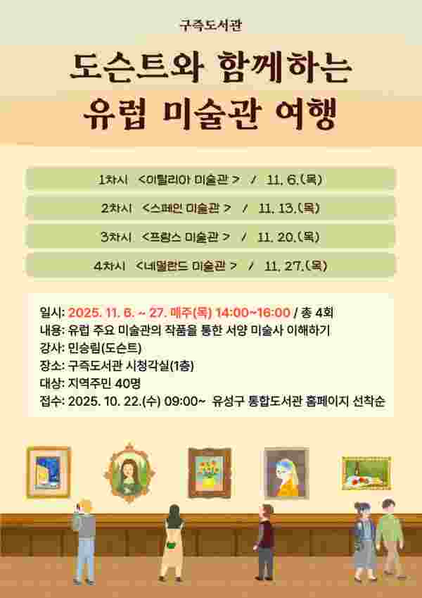[Ytv영상스토리] 대전 유성구는 11월 6일부터 27일까지 매주 목요일 구즉도서관에서 ‘도슨트와 함께하는 유럽 미술관 여행’ 강연을 개최한다.