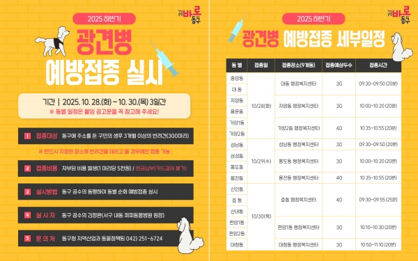 [Ytv영상스토리] 대전 동구는 광견병 발생을 예방하고 반려동물로 인한 인수공통전염병 확산을 방지하기 위해 오는 28일부터 30일까지 사흘간 2025년 하반기 광견병 예방접종을 실시한다고 22일 밝혔다.