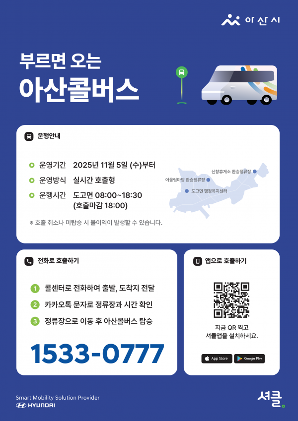 ‘아산콜버스’는 △콜센터 전화 △셔클 모바일 앱 △각 마을회관에 설치된 무인 단말기 중 편한 방법으로 호출해 이용할 수 있다.