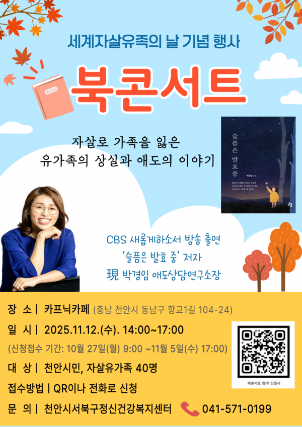 북콘서트에는 천안시민과 자살유가족 누구나 참여할 수 있으며 다음달 5일까지 홍보문 내 정보무늬 혹은 전화로 신청하면 된다.