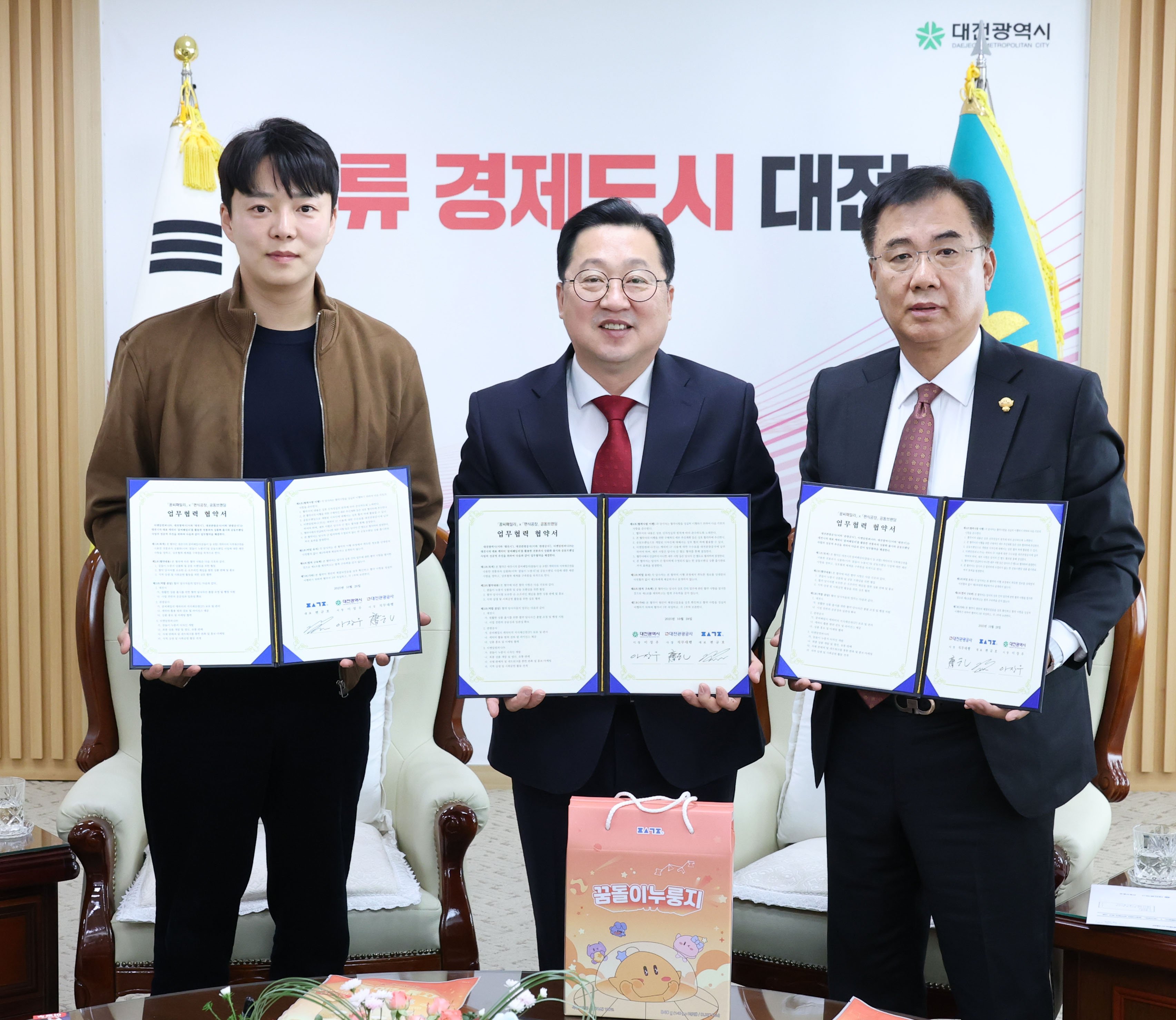[Ytv영상스토리] 대전시는 28일 대전관광공사, 티엔알컴퍼니(주)와 함께 꿈돌이 누룽지 출시를 위한 공동브랜딩 업무협약을 체결했다.
