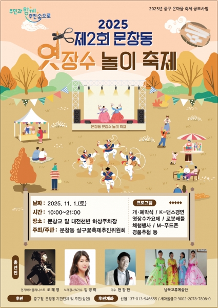 문창동 엿장수놀이 보존회와 풍물교실이 함께하는 길놀이를 시작으로 △주민자치프로그램 발표회 △엿장수 시민가요제 △K-청소년 댄스경연 등 주민참여형 프로그램이 진행된다.