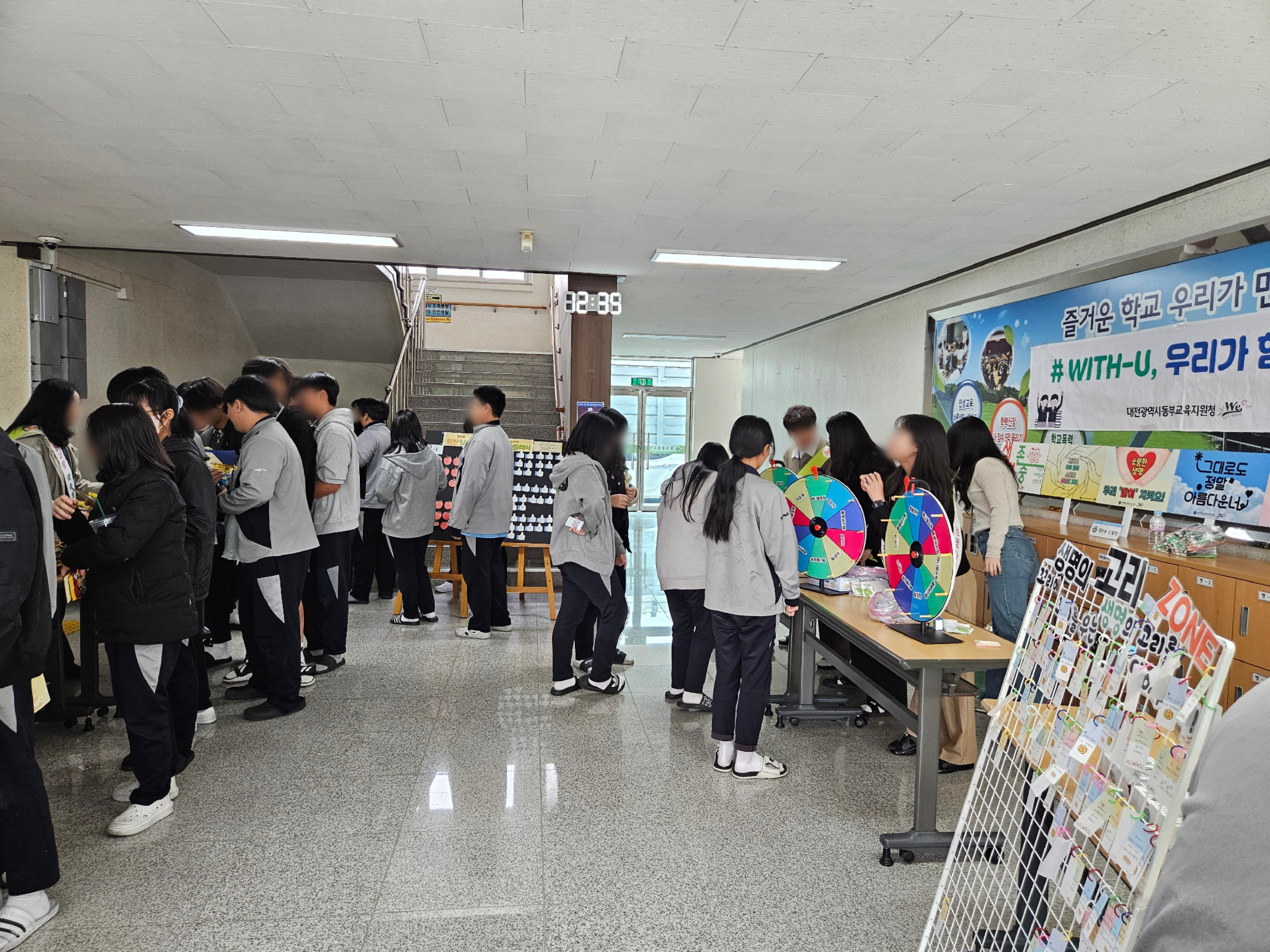 등굣길 캠페인에서는 학생들이 오늘의 기분을 스티커로 표현하고 룰렛 돌리기 활동을 통해 즐겁게 생명 존중의 의미를 되새길 수 있다.