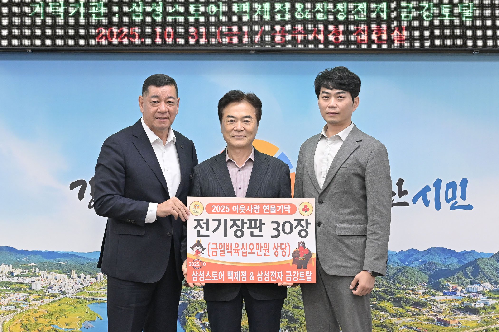 최원철 시장은 “정해남 대표와 삼성스토어 백제점의 따뜻한 나눔에 감사드린다”며 “이번 기부가 겨울철 어려운 이웃들에게 실질적인 도움이 될 것”이라고 전했다.