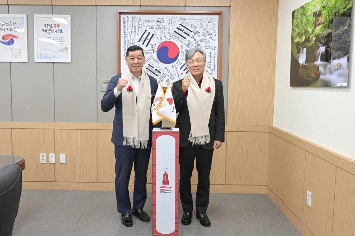 간담회에서 최원철 시장과 성우종 회장은 나, 가족, 이웃을 상징하며 함께 살아가는 사회를 만들어 나가자는 의미를 담은 사랑의 열매가 장식된 목도리를 서로에게 걸어주며 이번 캠페인이 따뜻한 나눔과 상생의 장이 될 수 있도록 함께 힘을 모을 것을 약속했다.