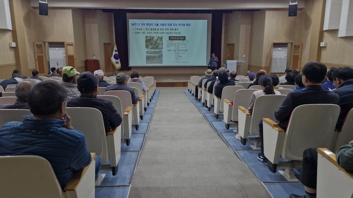 이날 교육은 ‘수확 후 동절기 과원관리 요령’과 ‘ 과수화상병 예방’을 주제로 진행됐으며 수확 이후 가지 전정, 병해충 방제, 시비 및 토양 관리 등 실질적인 관리 방법을 다뤘다.