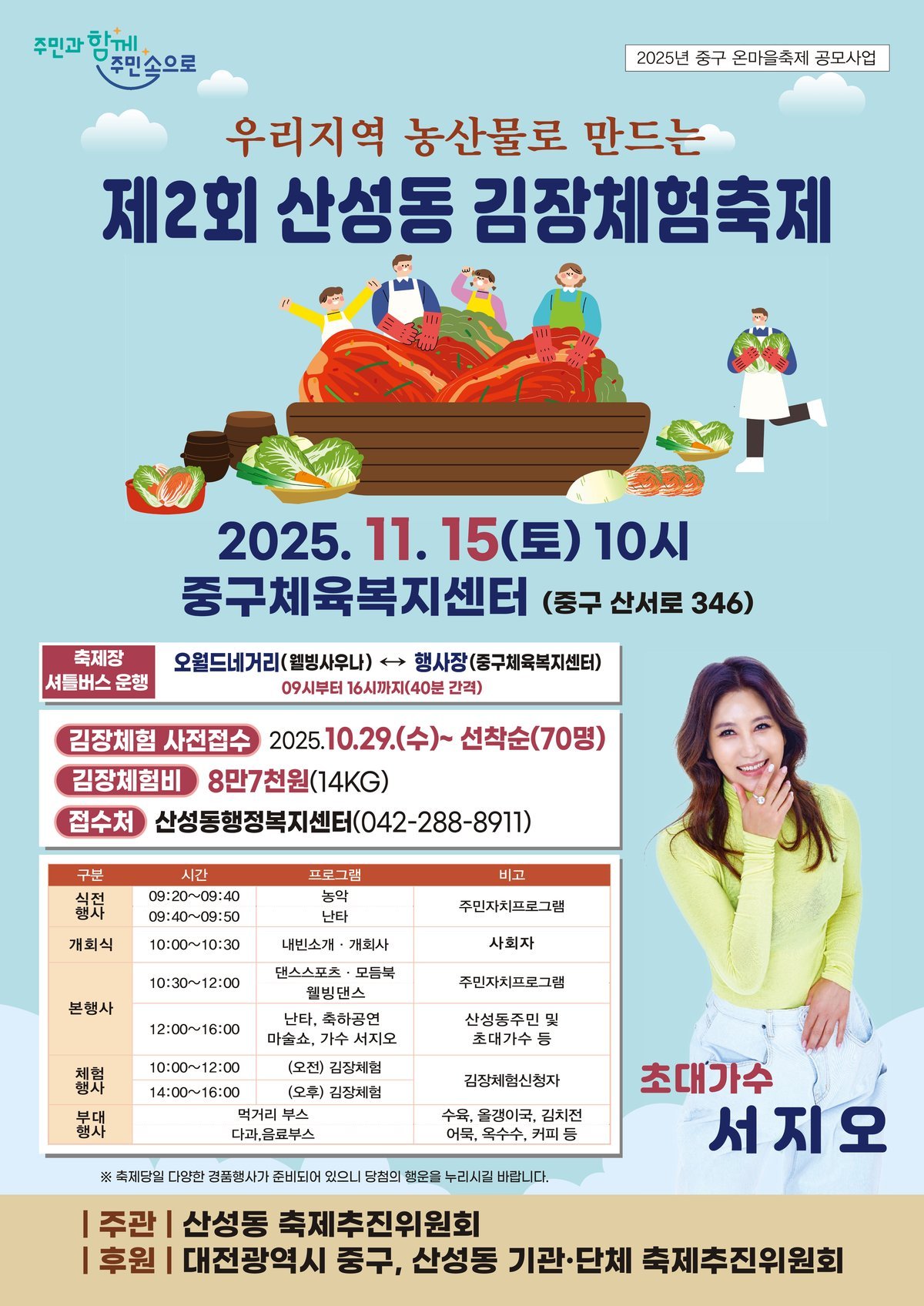 이번 축제는 2025년 중구 온마을축제 공모사업의 일환으로 산성동 축제추진위원회가 주최·주관해 김장체험, 주민자치프로그램 발표회, 초대가수 공연과 떡메치기 등 어린이와 함께 즐길 수 있는 다양한 체험과 풍성한 먹거리도 선보인다.