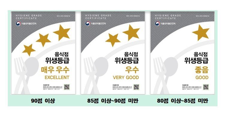 ‘음식점 위생등급제’는 일반음식점, 휴게음식점, 제과점을 대상으로 식품의약품안전처가 조리장·객석, 식재료, 위생관리 준수 여부 등 44개 항목을 평가해 매우우수·우수·좋음 3단계로 등급을 지정하고 이를 공개해 소비자의 선택권을 높이는 제도다.
