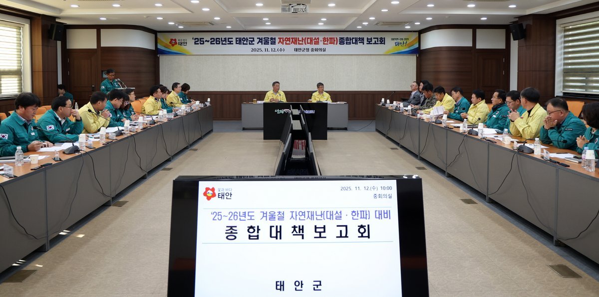 군은 지난 12일 군청 중회의실에서 부군수와 실국장, 관련 부서장, 읍면장, 기상청·유관기관 관계자 등 33명이 참석한 가운데 가세로 군수 주재로 ‘25~26년도 태안군 겨울철 자연재난 종합대책 보고회’를 열고 대응계획을 점검했다고 밝혔다.