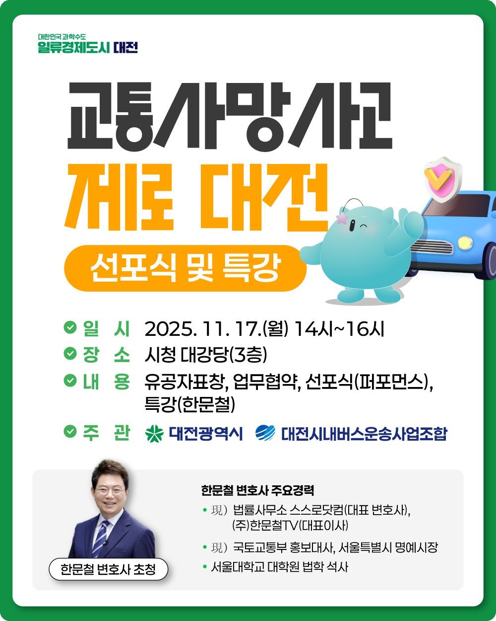 대전의 올해 교통사고 사망자 수는 10월까지 53명이 사망했다. 전년 대비 43% 증가한 추세로 시는 안전불감증과 운전자 인식 부족에 따른 문제로 분석하고, 시민 인식 개선과 교통안전 문화 확산을 위해 이번 선포식과 특강을 마련했다.