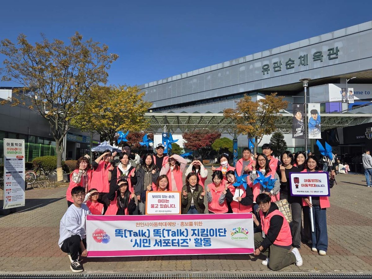 똑똑지킴이단 시민서포터즈가 16일 천안 유관순체육관에서 아동학대 예방·홍보 캠페인을 진행하고 있다.
