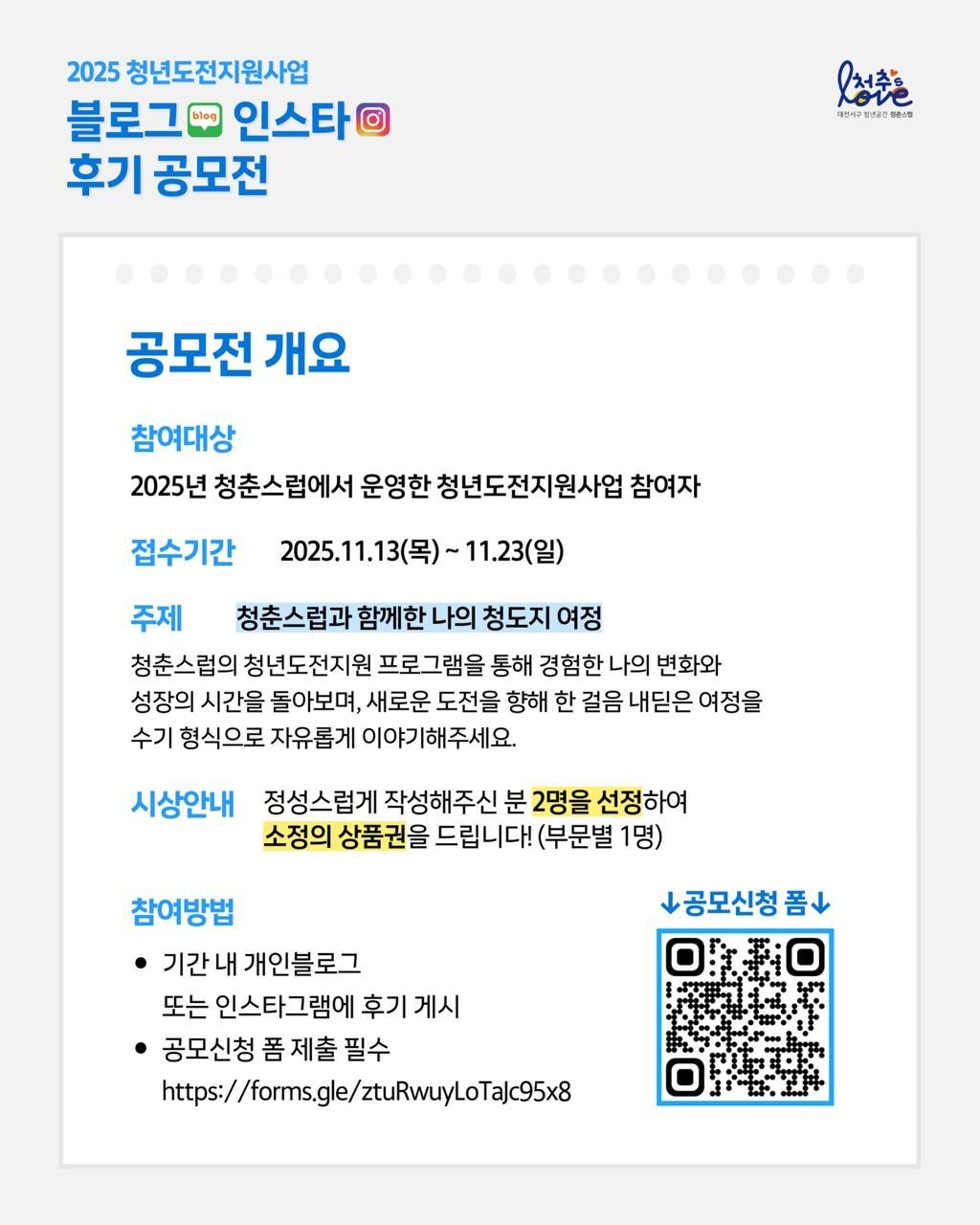 이번 공모전은 청년도전지원사업 운영기관인 청춘스럽에서 마련한 것으로, ‘나의 청도지 여정’을 주제로 청년들이 사업 참여를 통해 겪은 변화와 도전의 과정을 직접 기록하고 확산하는 데 목적이 있다.