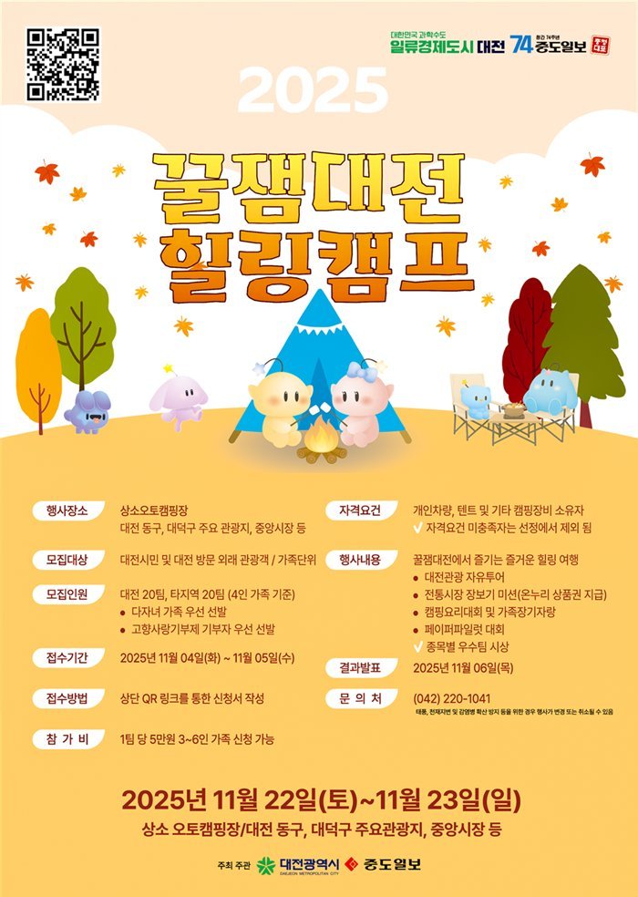 이번 힐링캠프에는 대전 시민 20팀과 타 지역 참가자 20팀 등 총 40팀의 가족단위 참가자들이 참여하며 전통시장 장보기 미션, 캠핑요리대회, 가족장기자랑, 힐링음악회 등 다채로운 프로그램을 통해 지역문화를 체험하고 가을 정취를 만끽할 예정이다.
