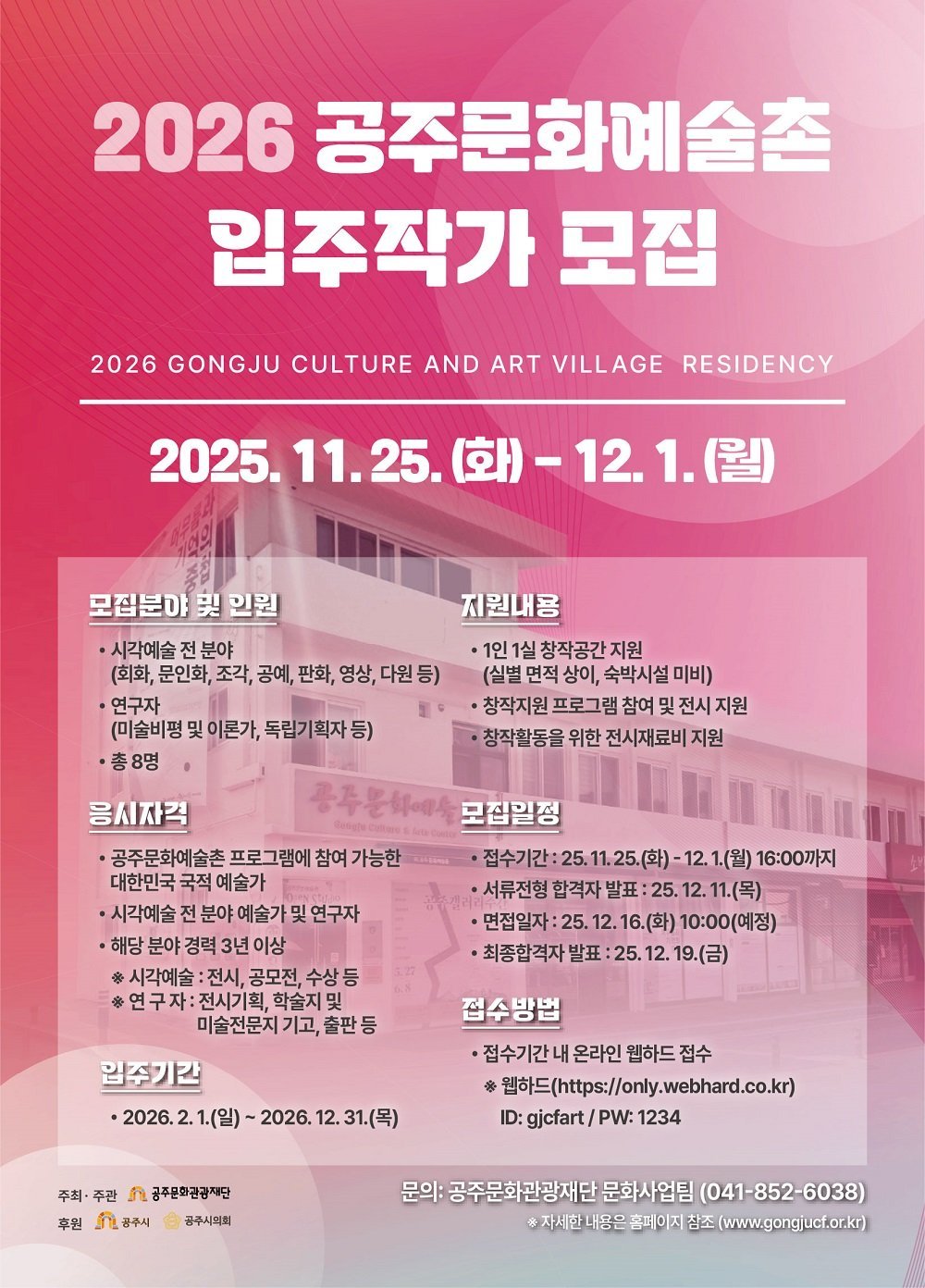 선정된 입주작가는 2026년 2월 1일부터 12월 31일까지 1인 1실 창작공간 제공을 비롯해 창작지원 프로그램 참여를 통한 전시 지원 및 전시재료비 지원 등 다양한 혜택이 제공된다.
