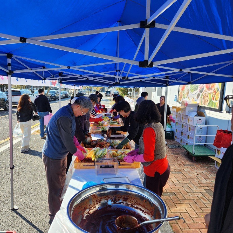 *사진설명: 청양먹거리직매장 학하점에서 진행한 ‘2025 김장체험 및 나눔 행사’에서 참가자들이 청양산 절임배추와 지역 농산물로 정성껏 김치를 담그고 있다.