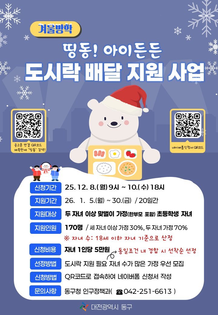 겨울방학 띵동 아이든든 도시락 배달 지원사업 홍보문 대전동구 제공
