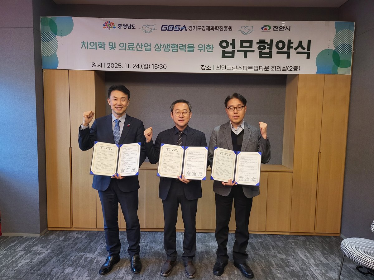 도는 24일 천안시 그린스타트업타운에서 천안시, 경기도경제과학진흥원과 국립치의학연구원 천안 설립 및 치의학산업 육성을 위한 초광역 협력 업무협약을 체결했다고 밝혔다.
