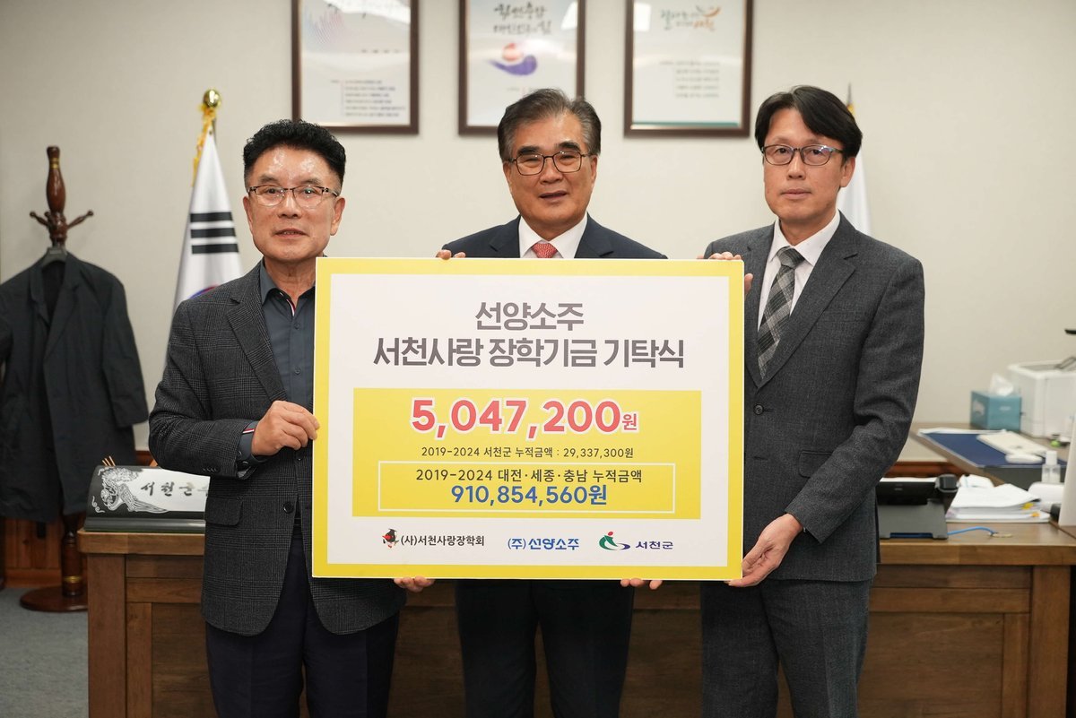 강경모 서천사랑장학회 이사장은 “오랜 기간 지역 인재 양성을 위해 지속적인 관심과 지원을 보내주신 선양소주에 깊이 감사드린다”며 “기탁금은 학생들의 배움과 성장을 돕는 장학사업에 소중히 사용하겠다”고 밝혔다.