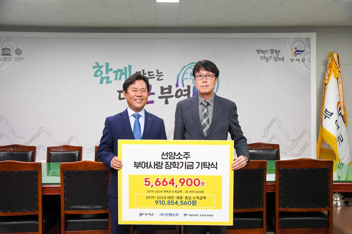 [Ytv영상스토리] ㈜선양소주는 지난 26일 부여군청을 방문하여 인재 육성을 위한 장학금 566여만 원을 부여군굿뜨래장학회에 기탁했다.