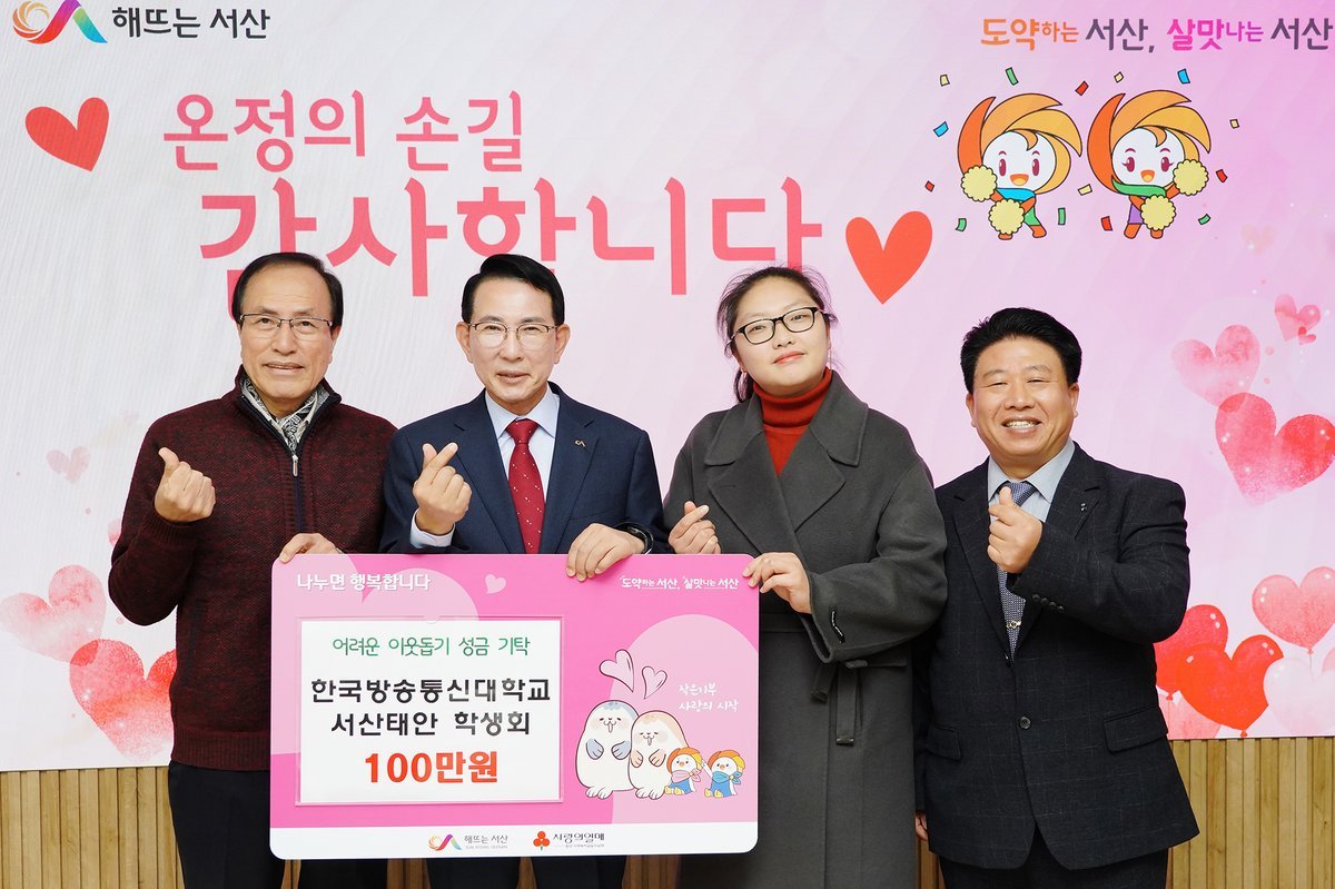 이어진 한국방송통신대학교 서산태안학생회 기탁식에서는 이상민 한국방송통신대학교 서산태안학생회 회장 등이 참석했다.