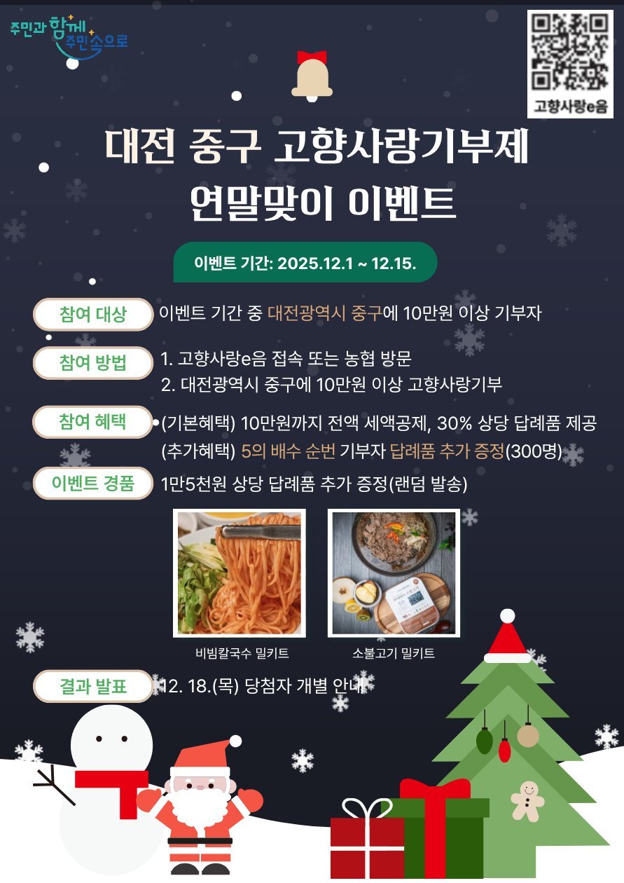 대전 중구, 연말맞이 고향사랑기부제 답례품 추가 증정 이벤트 실시- 신규 입점 공급업체 답례품 추가 증정…세액공제·지역특산물 혜택까지 - (대전중구 제공)